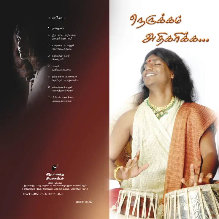 Tamilநெருக்கம் அதிகரிக்க... -பரமஹம்ஸ நித்யானந்தர் நித்யானந்த தியானபீடம் இந்த புத்தகம் நித்யானந்த வேத அறிவியல் பல்கலைகழகத்தின் வெளியீடாகும் நூலின் பெயர் : நெருக்கம் அதிகரிக்க... ஆசிரியர் : பரமஹம்ஸ நித்யானந்தர். முதல்பதிப்பு : ஜூன் 2006 இரண்டாம் பதிப்பு : மார்ச் 2008, 3000 பிரதிகள் ஒளியிச்சு, வெளியீடு : தியானபீட சேரிட்டின் டிரஸ்ட் நித்யானந்தபுரி, கல்லுஹோபல்ஹல்லி மைசூர் மெயின்ரோடு, பிடதி - 562 109. பெங்களூர். கர்நாடகா போன் : 080-27202085, 080-65591844 அட்டை வடிவமைப்பு : தியானபீட சேரிட்டின் டிரஸ்ட் அச்சி