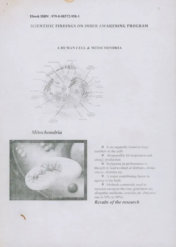 EnglishMitochondria Is an organelle found in large numbers in the cells Responsible for respiration and energy production Reduction in performance is thought to lead to onset of diabetes, stroke, cancer, diabetes etc. A major contributing factor in ageing of the body Methods commonly used to increase energy in this tiny generators are allopathic medicine, exercise etc. (Success rate is 30% to 50%)